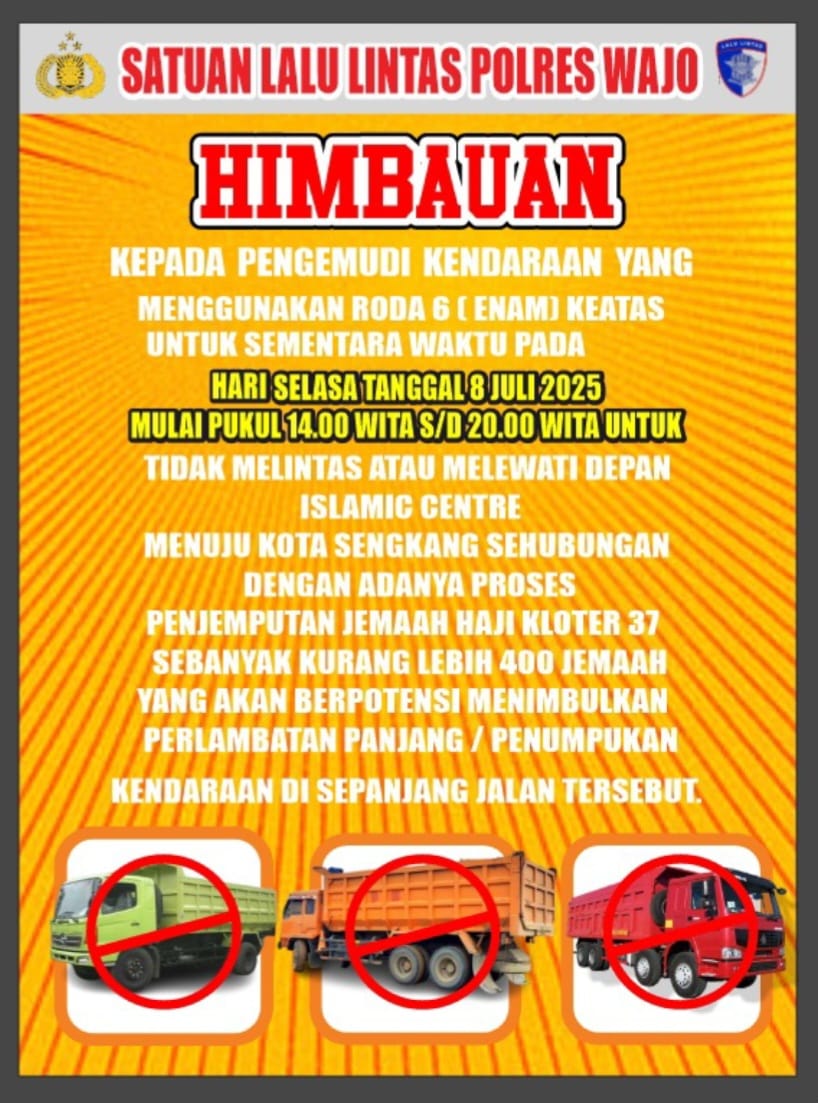 Tajukjurnalis.net, WAJO – Dalam rangka menyambut kedatangan Jemaah Haji asal Kabupaten Wajo pada Selasa, 8 Juli 2025 mendatang, Satuan Lalu Lintas (Satlantas) Polres Wajo akan memberlakukan rekayasa lalu lintas di sejumlah titik strategis di wilayah Kota Sengkang dan sekitarnya, khususnya di kawasan Islamic Centre.