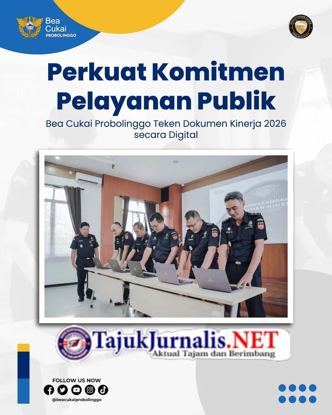 Tajukjurnalis.net, Probolinggo -Bea Cukai Probolinggo melaksanakan penandatanganan Dokumen Kinerja Tahun 2026 pada Jumat (30/1/2026) dengan memanfaatkan Tanda Tangan Elektronik (TTE). Pemanfaatan TTE ini menjadi wujud komitmen Bea Cukai Probolinggo dalam mendukung transformasi digital, efisiensi birokrasi, serta penguatan tata kelola pemerintahan yang akuntabel.