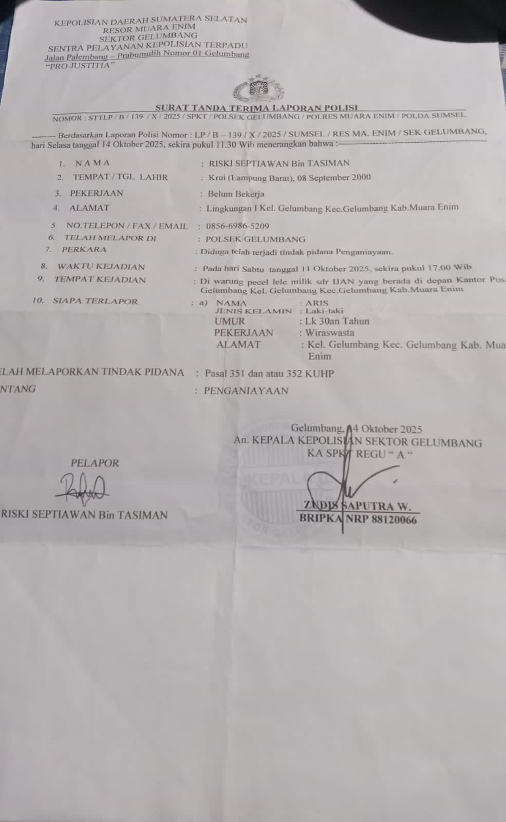 Nomor,STTLP/B/X/2025/SPKT/POLSEK GELUMBANG /POLRES MUARA ENIM/POLDA SUMSEL.
