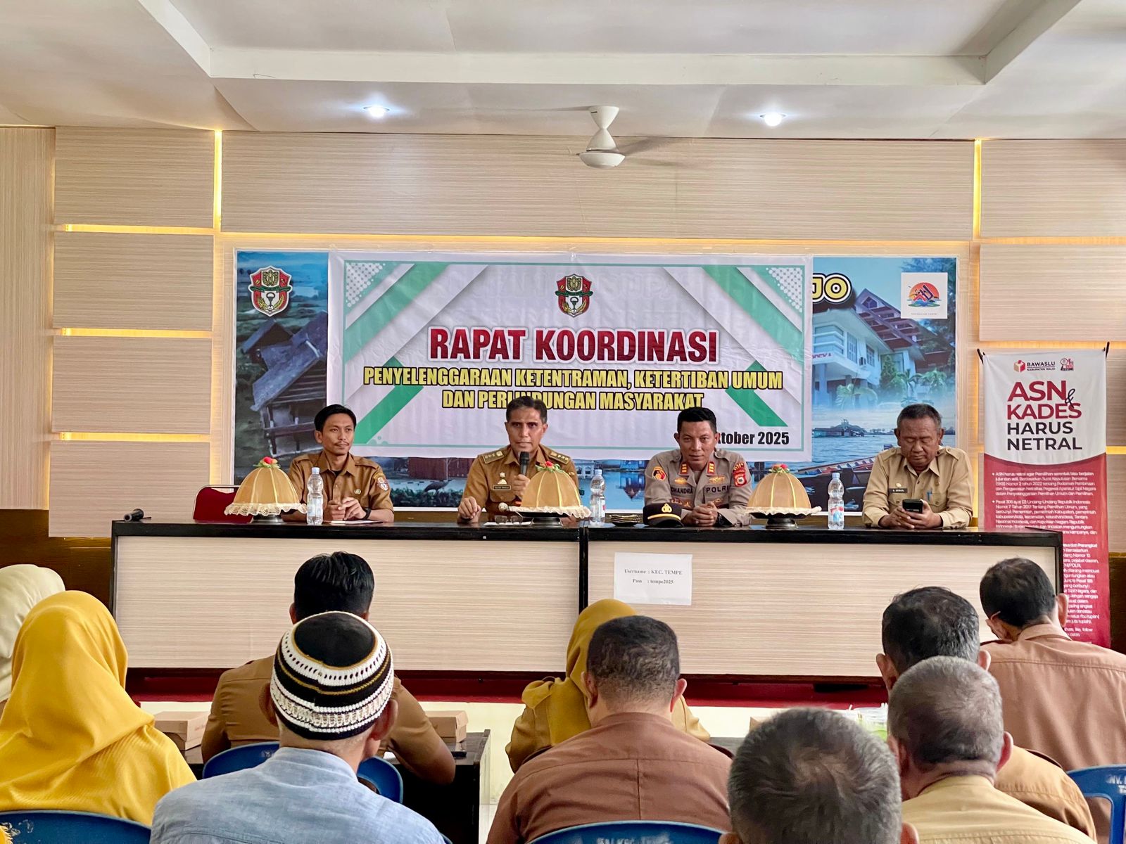 WWW.TAJUKJURNALIS.NET, WAJO — Kapolsek Tempe, AKP Candra Said Nur, S.H., M.H., menghadiri Rapat Koordinasi Penyelenggaraan Ketentraman, Ketertiban Umum, dan Perlindungan Masyarakat yang digelar oleh Pemerintah Kecamatan Tempe, Selasa (21/10/2025) pagi, bertempat di Aula Kantor Kecamatan Tempe, Jalan Bau Baharuddin, Kelurahan Bulu Pabbulu, Kecamatan Tempe, Kabupaten Wajo.